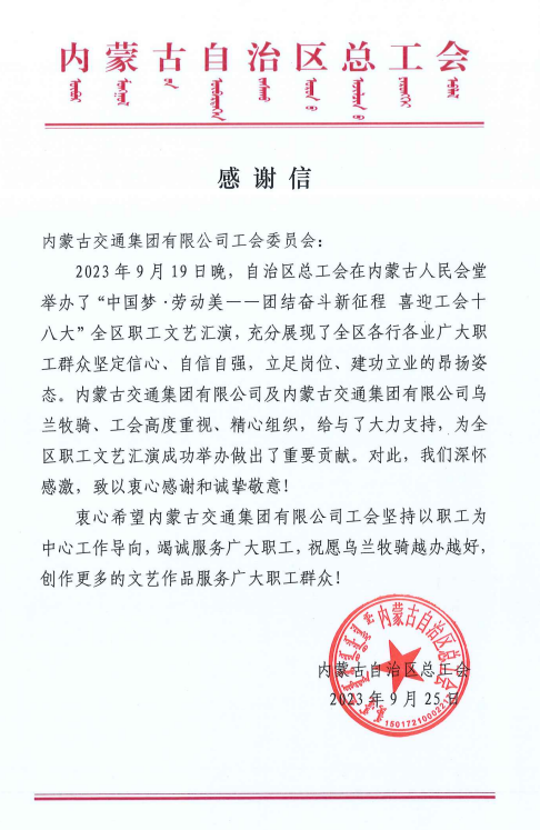 信中写道,2023年9月19日晚,内蒙古自治区总工会在内蒙古人民会堂举办了“中国梦·劳动美——团结奋斗新征程 喜迎工会十八大”全区职工文艺汇演,充分展现了全区各行各业广大职工群众坚定信心、自信自强、立足岗位、建功立业的昂扬姿态。99ri视频在线观看国产及99ri视频在线观看国产乌兰牧骑、工会高度重视、精心组织,给予了大力支持,为全区职工文艺汇演成功举办作出了重要贡献。