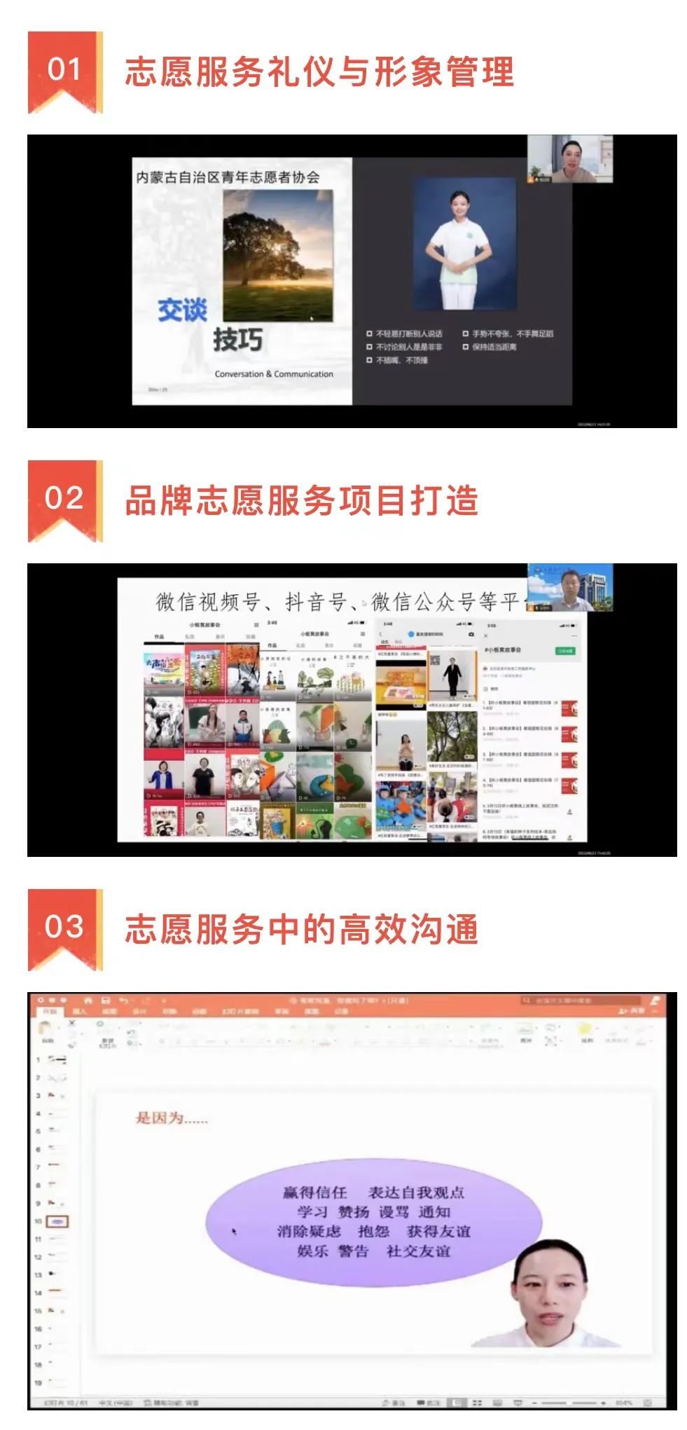 本次培训以“学习贯彻习近平总书记重要讲话精神,推动内蒙古青年志愿服务现代化发展”为主题,邀请中国志愿服务联合会理事,中国青年志愿者协会常务理事张祖平教授、江苏航运职业技术学院人文艺术学院梅迎春副教授及北京城市学院研究生导师、首都志愿服务项目大赛评委会委员黄冠华老师分别围绕“志愿服务礼仪与形象管理”“品牌志愿服务项目打造”“志愿服务中的高效沟通”进行专题授课,课堂气氛活跃,讲解生动,内容详实,进一步帮助广大青年夯实志愿服务知识,增强志愿服务意识,提高志愿服务效能。培训结束后,“志愿北疆 APP”将记录用户“荣誉时长”,并获得由内蒙古青年志愿者协会颁发的“电子结业证书”。