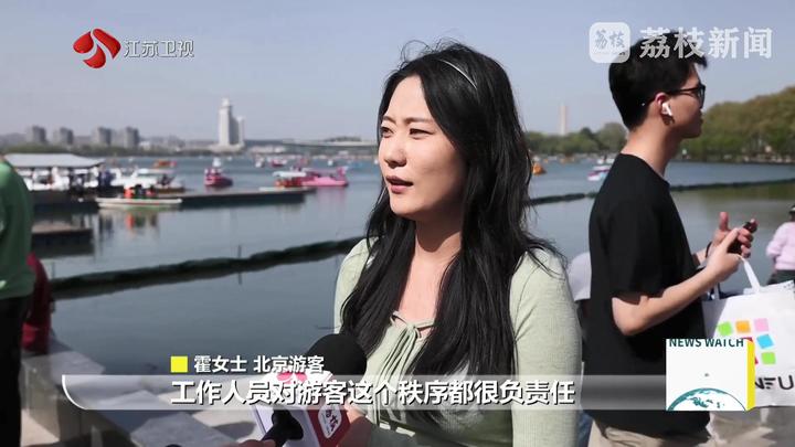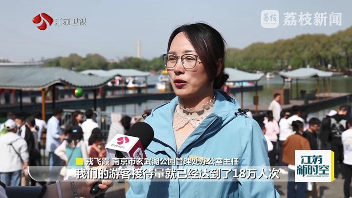荔枝新闻中心记者范洁萍说:“这里是南京市玄武湖景区,清明假期,很多游客来这里踏青赏花,享受一份假期的松弛感。人气有多高呢?在不远处的玄武湖游船码头上,此刻一艘游船都没有了。目前,景区近600条观光游船全部都在湖面上。”