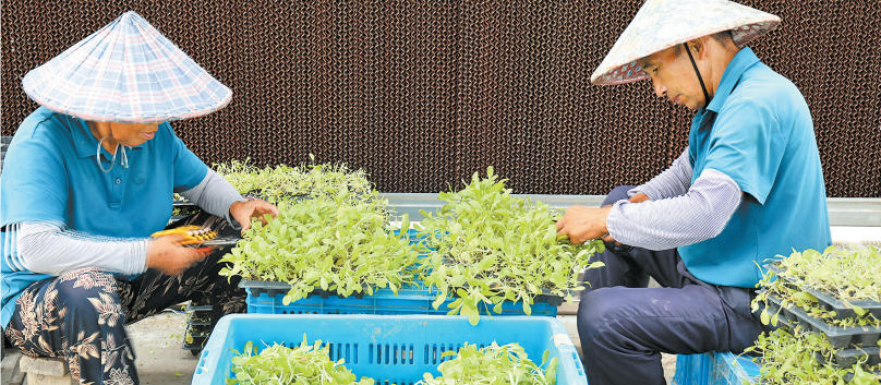 日前,梅李镇一蔬菜基地,菜农正在采摘鲜嫩的小青菜,第一时间供应巿场。