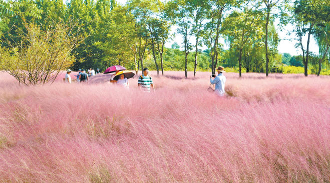 日前,秋日限定的粉黛乱子草进入了最佳观赏期,南湖湿地公园内的粉黛乱子草披上粉红“衣裳”,吸引游客慕名而来。