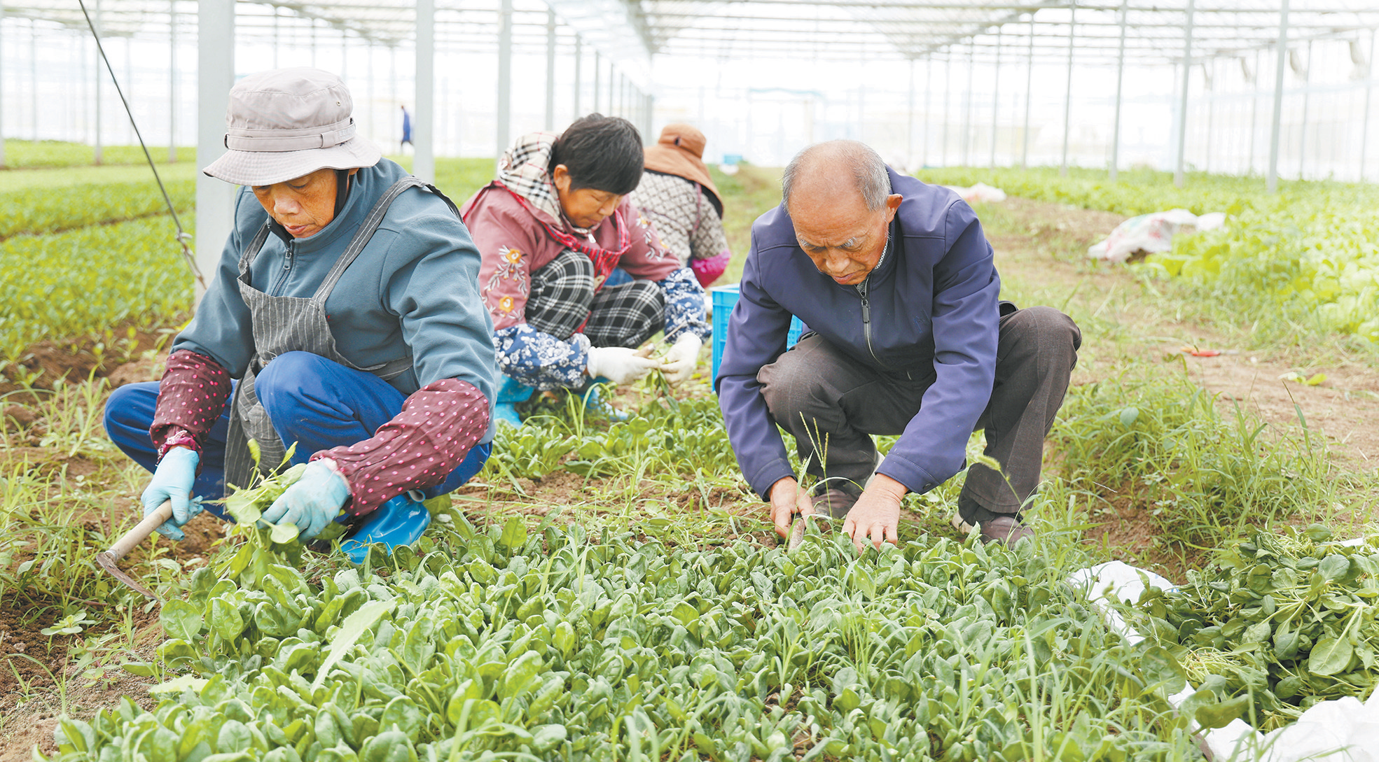 10月22日,常熟市金辰农场,菜农正在收割嫩绿的菠菜,剔除杂草,准备供应市场。