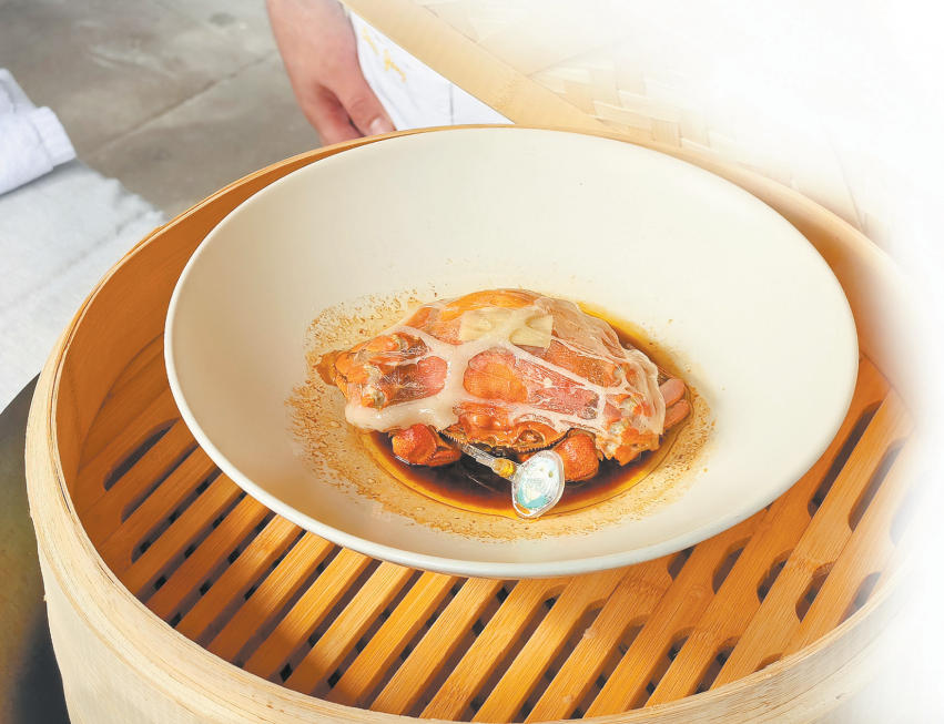 困惑终需实践来解。在酒店的支持下,陈杨杨带领团队踏上了复原这道传统菜的探索之路。为了忠实还原美味,团队坚持选用阳澄湖大闸蟹,须是青背白肚、金爪黄毛、蟹壳饱满、捏之硬实的上品。而对关键的猪油,陈杨杨更是精益求精,必选上等板油自行熬制,待冷凝后直接将之覆于蟹黄之上,“猪油能最大限度地锁住大闸蟹的鲜味与水分,使其在蒸制过程中由内而外滋润起来。成品鲜上加鲜,油润却不腻口。”陈杨杨说。