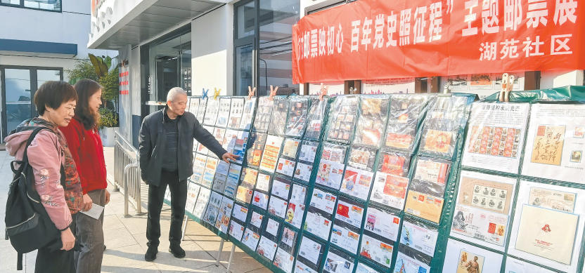 日前,琴川街道湖苑社区举办“方寸邮票映初心百年党史照征程”主题邮票展,吸引了不少居民与集邮爱好者驻足观展。
