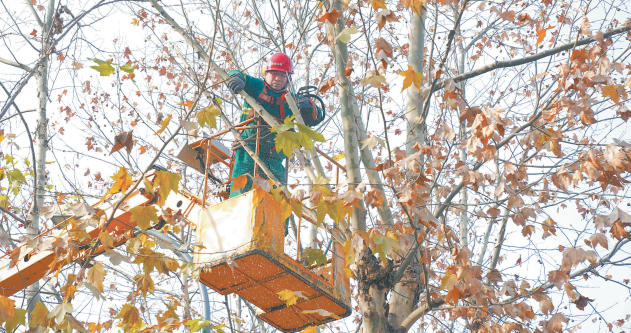 连日来,绿化部门组织人员对城区行道树进行修剪,有效控制树形,排除树木枯枝对行人和车辆带来的安全隐患。图:工作人员在闽江西路修剪树木。