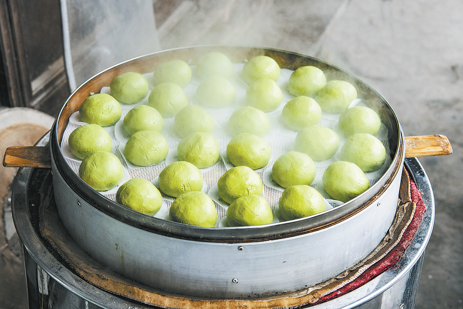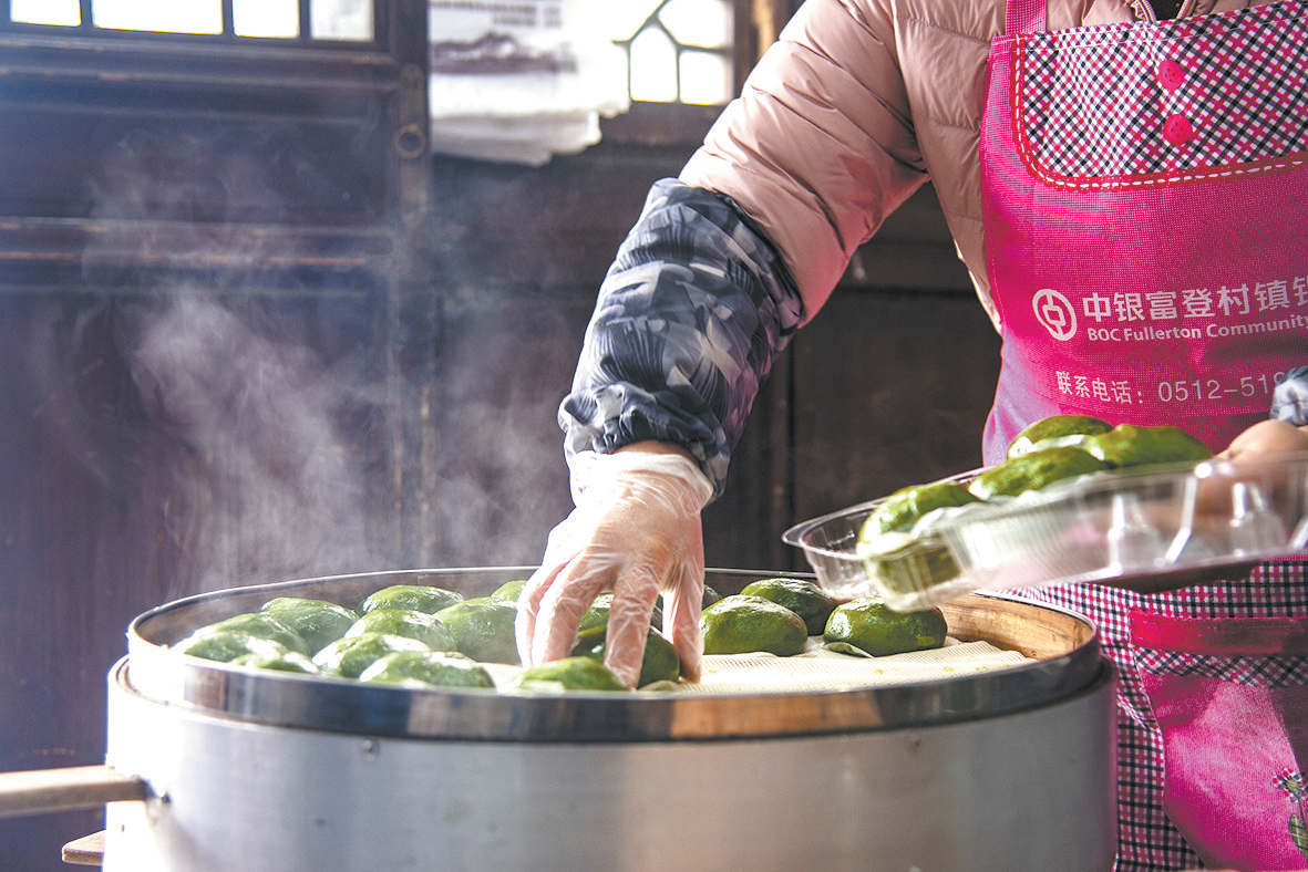 2月28日上午,古里镇李市村王阿金糕团店里人头攒动,不少老顾客循着微信朋友圈的上市消息专程前往尝鲜。店铺后厨,79岁的王阿金与儿媳张爱萍默契配合,揉面、称重、包馅、蒸制,一道道工序娴熟流畅。将新鲜的浆麦草汁与糯米粉充分融合,揉成柔韧的面团,精准称重80克后,包裹豆沙、梅干菜、蛋黄肉松等馅料,放入蒸笼蒸制。不到20分钟,一屉屉色泽翠绿的青团就出炉了。