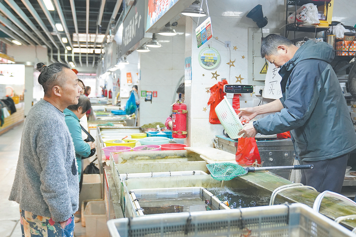 3月24日上午9时许,五星农贸市场水产区,摊主胡建岳的摊位前已摆开阵势。暂养池中,按个头大小分盆陈列着的小龙虾身披红甲,双钳高举,生龙活虎。不时有顾客驻足询价,胡建岳一边热情招呼,一边捞起一网兜让顾客细看,“都是金湖清水小龙虾,品质好,滋味鲜。”