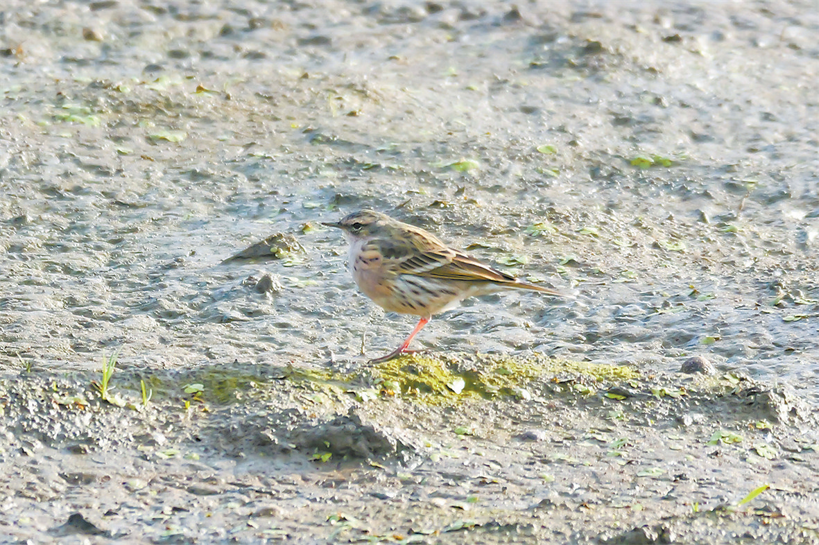 4月7日傍晚,观测人员正按计划进行日常监测。沙家浜湿地公园区域风力较强,一处可避风的芡实塘低洼地带吸引了众多鸟类觅食,也成为观测人员的重点关注区域。忽然,一只与白鹡鸰一同在泥地中活动的鹨引起了观测人员的注意——其胸口呈现出鲜明而独特的粉红色,上体呈橄榄灰色,布满清晰的黑褐色纵纹,一条粉皮黄色的粗眉纹从喙基一直延伸至眼后。停栖时,它的尾羽有规律地上下摆动,偶尔低头在泥缝中啄食,动作轻快而敏捷。观测人员当即意识到,这是一只此前从未在本地见过的粉红胸鹨。经拍摄照片比对鉴定,这一判断得到了确认。