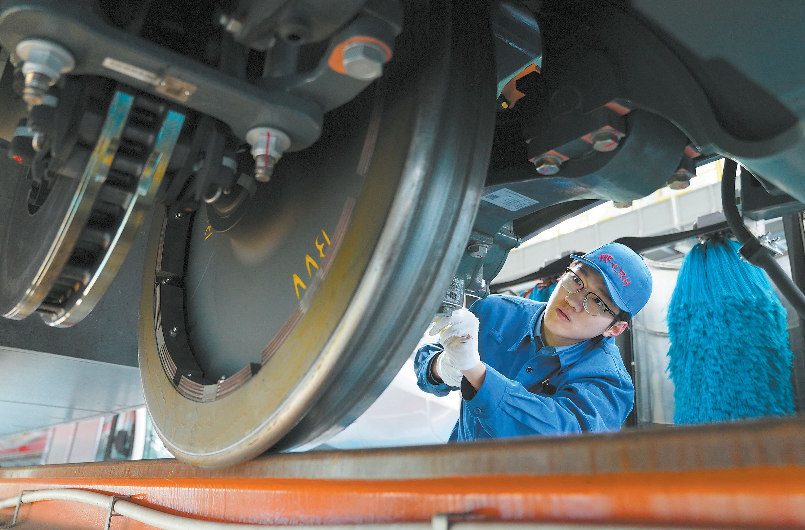 1月20日,中国铁路北京局集团有限公司北京动车段的工作人员在朝阳动车所检修动车组列车。