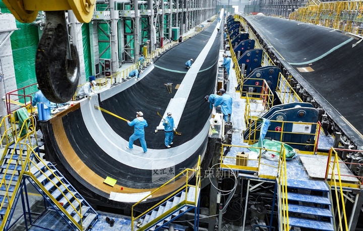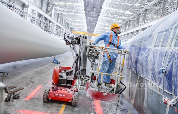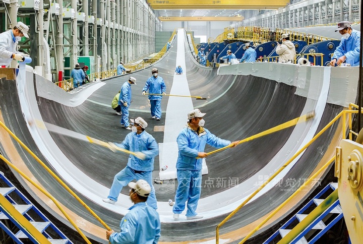 走进码头几公里外的射阳中车风电叶片工程有限公司生产车间,记者瞬间被眼前的景象震撼。百米级的巨型模具如同躺卧的鲸鱼骨架,工人们正在其内部进行精细的玻璃纤维布铺设作业。不同于传统印象中火花四溅的重工业,这里的制造更像是一场精密的“刺绣”。