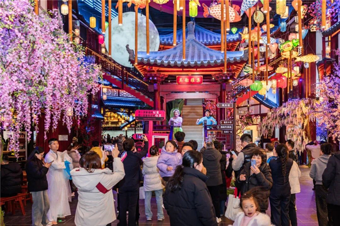 走进服务区,首先映入眼帘的是一座江南特色牌坊,牌坊后是复刻唐宋建筑风貌的美食街,飞檐翘角、叠山理水、亭台廊榭,古意盎然。嘉兴粽子、无锡脚踏糕等传统小吃香气四溢;咖啡、奶茶等饮品同步配齐。身着唐宋服饰的服务人员穿梭其间,琴箫演奏、唐宋歌舞等适时上演,构建起“视听味触”全方位的唐宋生活场景,让旅客在片刻休憩中“穿越时空”,实现“路过即打卡、停留即体验”。