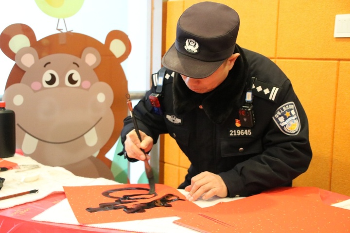 签到区,雨花台派出所丁墙社区片警张戊民警官挥毫泼墨,一张张“福”字在红纸上绽放。这不是简单的签到,而是一场“福气”的接力。老人们或驻足欣赏,或主动提笔,欢声笑语中,“百福墙”迅速成形,传递出浓浓的年味。