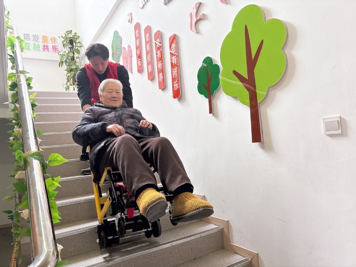 值得一提的是,社区特意准备了爬楼机,让“不便”不再是缺席的理由,这也是丁墙社区联合悦心养老打造“科技+人文”养老服务的缩影。当刘奶奶被稳稳托举着抵达现场时,掌声与欢笑瞬间将她包围。这台爬楼机,是助力出行的工具,更是社区的无声承诺:每一位老人的“在场”,都值得全力以赴。