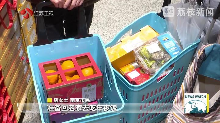 南京市民唐女士说:“买了一些生蚝、三文鱼,还有一些水果,准备回老家去吃年夜饭,所以带一点食材,正好超市就在家门口很方便。”南京市民陆屾说:“今天是除夕,买了一些东西,感觉品种还是比较齐的,所以到这边来一站式采购还是挺好的。”