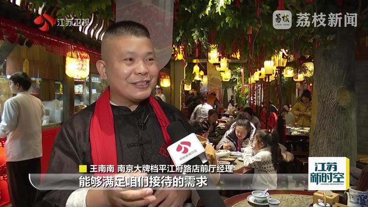 餐饮消费同样火热,中午12点,记者在南京夫子庙景区的南京大牌档看到,张灯结彩的节日氛围扑面而来,大厅几乎坐满了就餐的顾客,其中近7成是来宁旅游探亲的外地游客。