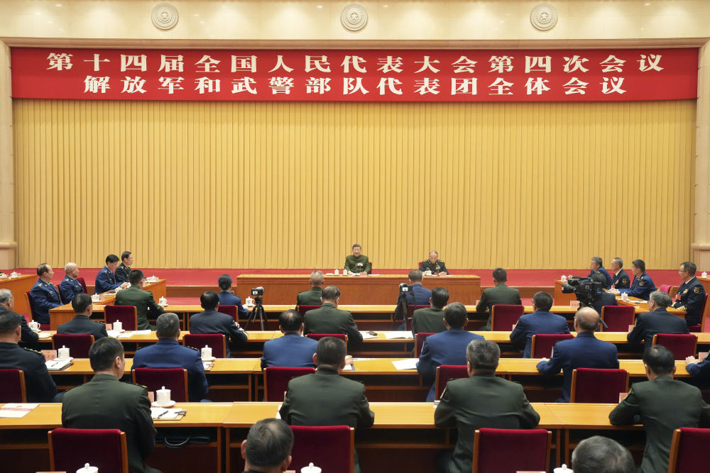 3月7日下午,中共中央总书记、国家主席、中央军委主席习近平出席十四届全国人大四次会议解放军和武警部队代表团全体会议并发表重要讲话。新华社记者李刚摄