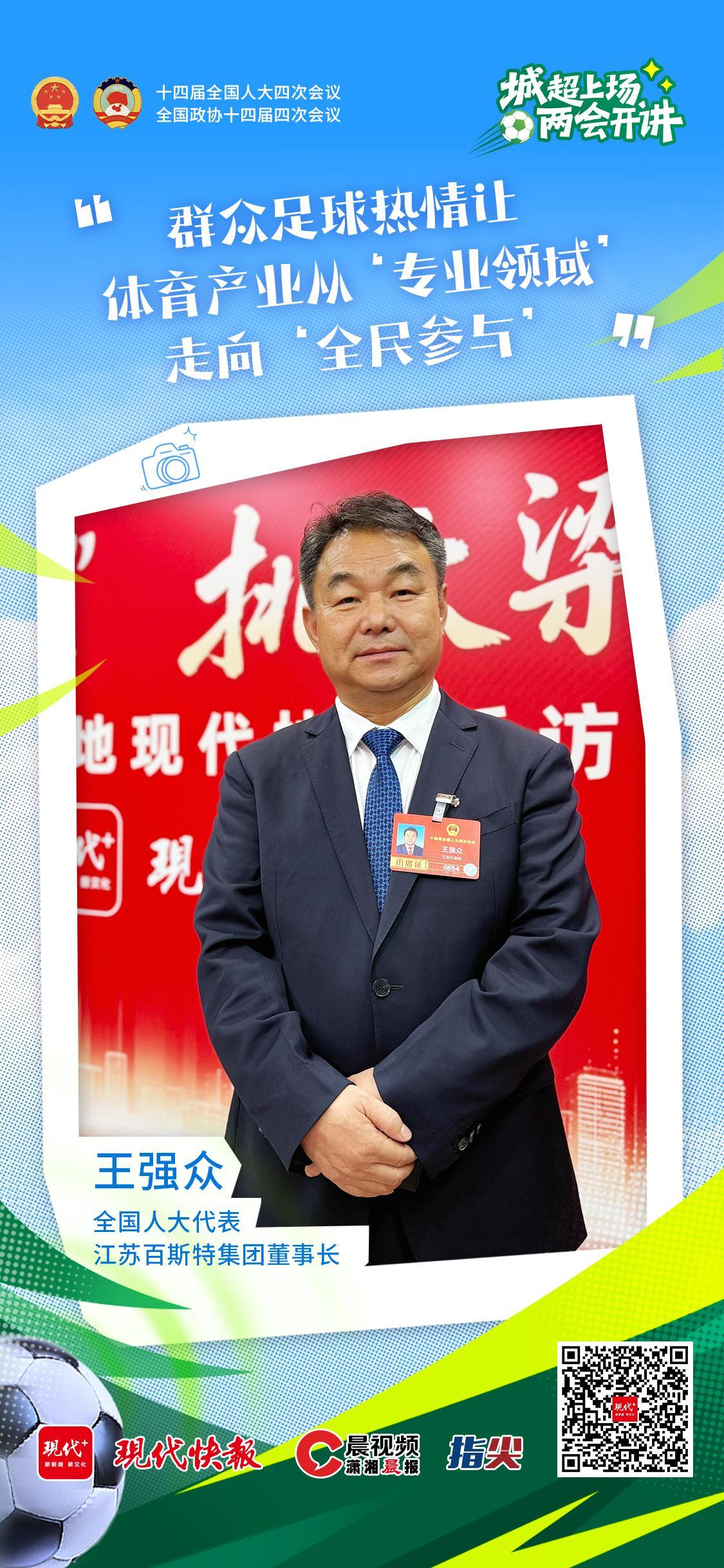 全国人大代表、江苏百斯特集团董事长王强众立足产业一线视角,分享了全民足球热潮带来的产业变革与深度思考。