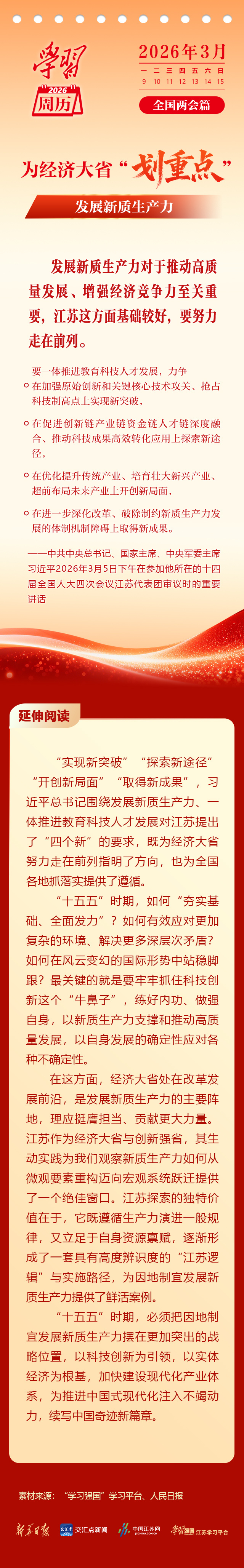 《学习周历》特推出“2026全国两会篇”,聚焦习近平总书记对江苏的殷殷嘱托,在“十五五”开局之年,为经济大省“划重点”。本期,一起学习“发展新质生产力”相关重要内容。