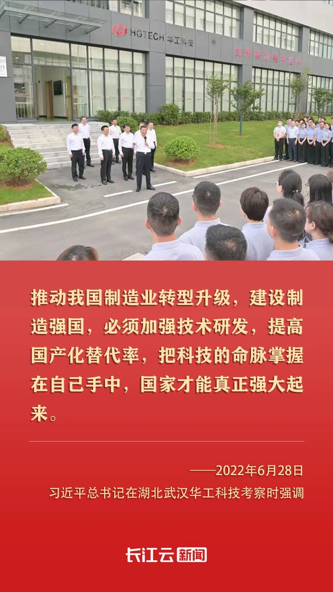2022年6月,习近平总书记来到湖北武汉考察,第一站就来到光谷,来到华工科技。他指出,湖北武汉东湖新技术开发区在光电子信息产业领域独树一帜。要加强技术研发攻关,掌握更多具有自主知识产权的核心技术,不断延伸创新链、完善产业链,为推动我国光电子信息产业加快发展作出更大贡献。
