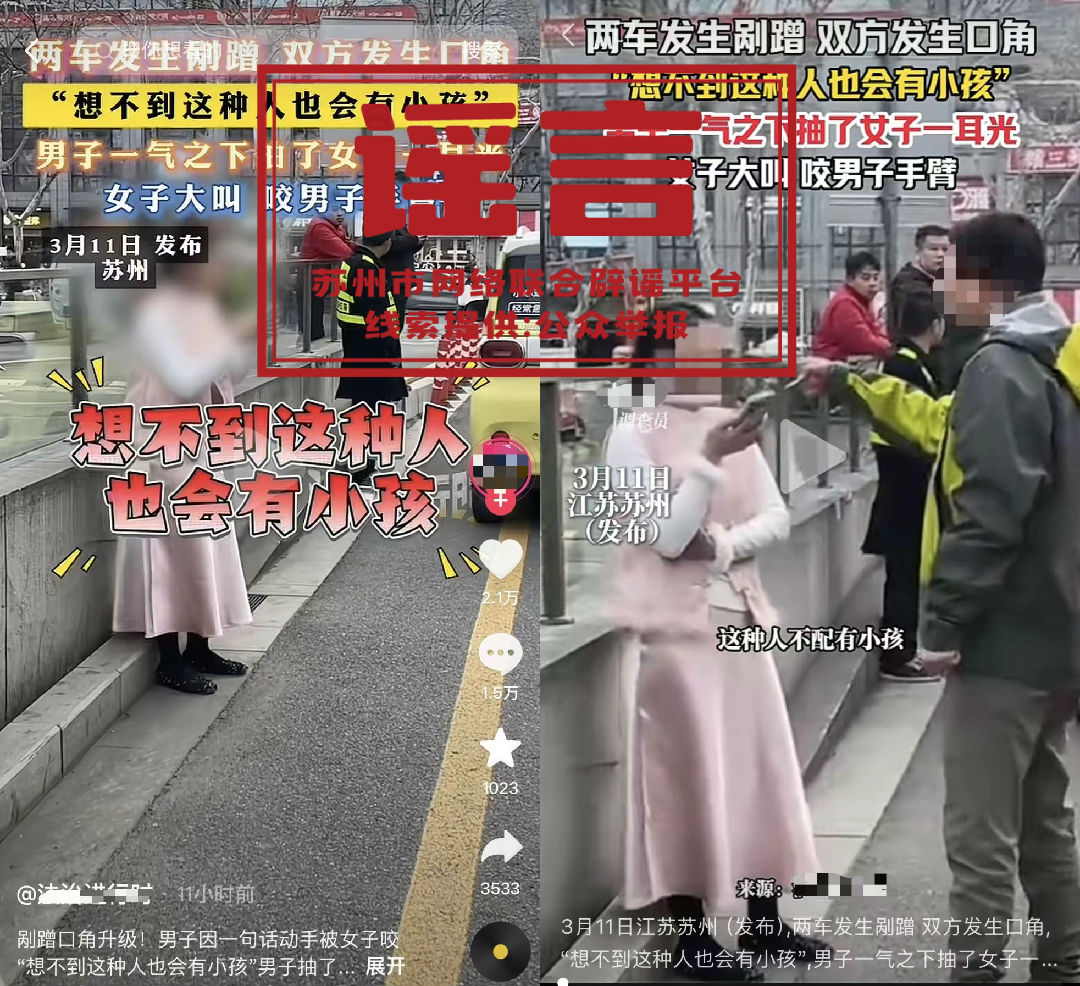 近日,有部分账号将一社会热点事件错误标注为苏州。据公开报道,3月8日,江苏扬州发生一起因交通事故引发的纠纷,疑因一女子驾车堵路引发堵塞,拒绝挪车,男子上前理论引发口角。当地交警已介入处置。