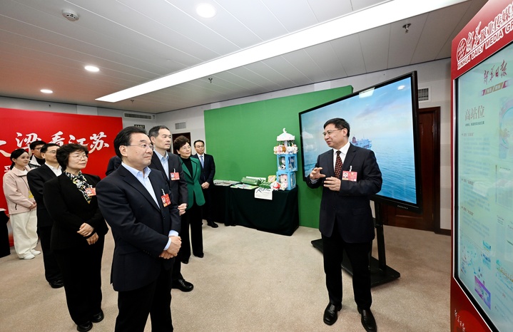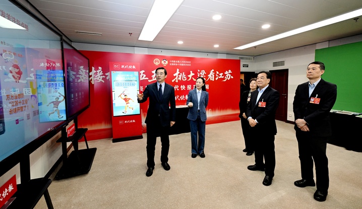 今年全国两会,省内新闻媒体深化融媒创新、强化技术赋能,全方位呈现大会盛况。在新华报业传媒集团、江苏广电总台、现代快报的采访间,信长星、刘小涛、张义珍与编辑记者交流,听取选题策划、栏目设置、版面安排、国际传播等情况介绍,观看新媒体作品演示,充分肯定两会报道取得的成绩。