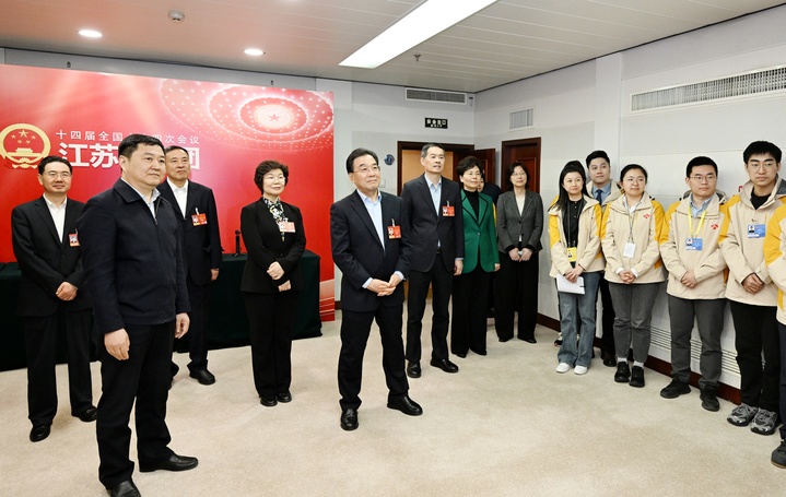 3月10日,省委书记、省人大常委会主任信长星,省长刘小涛,省政协主席张义珍在江苏代表团驻地看望参加全国两会报道的中央媒体和江苏媒体编辑记者。