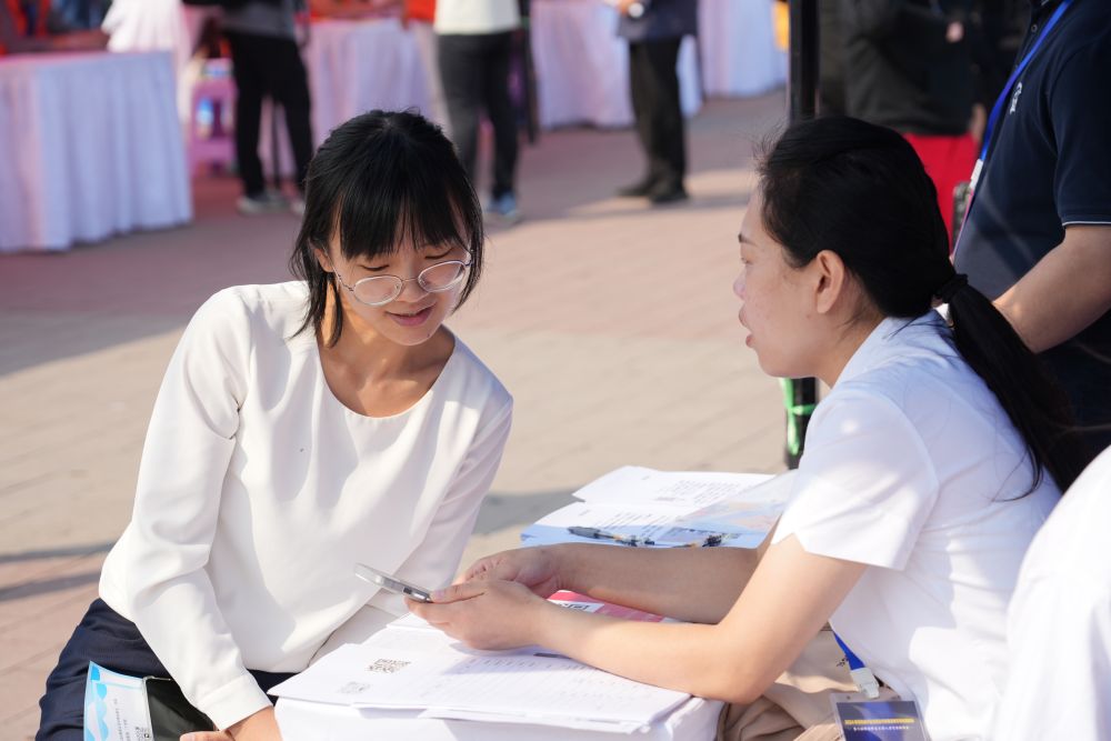 2024年9月25日,求职者(左)在招聘会现场与招聘单位工作人员交流。当日,雄安新区举办2024年河北省毕业生就业市场雄安新区专场招聘会暨河北雄安新区大型人力资源招聘会。招聘会以“稳岗就业聚才发展”为主题,邀请京津冀地区共157家企业线下参会,提供就业岗位4783个。