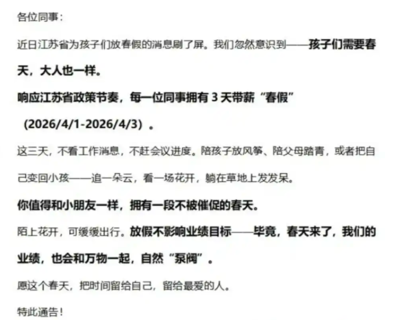 从政府层面的制度保障,到企业层面的主动担当,从灵活调休的贴心安排,到全员带薪春假的温情尝试,江苏正以一系列务实举措,让美好的春光,照进更多人。