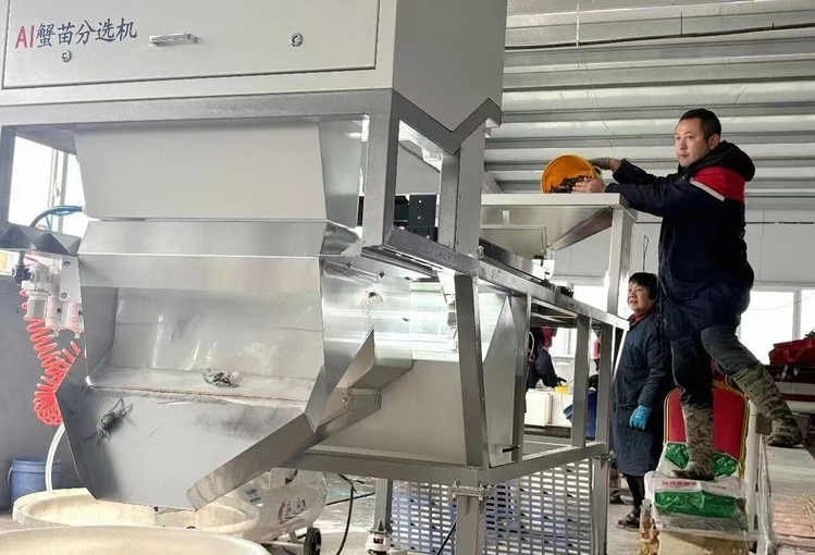 塘口边,养殖户招付松和工人正忙碌着。他们从暂养池打捞起鲜活的蟹苗,直接送上AI分选机的传送带。传送带上,密密麻麻的蟹苗整齐列队,“奔赴”识别区。头顶高清摄像头瞬间捕捉图像,人工智能系统毫秒间完成公母识别,分别落入筐中,短短1分钟,上百只蟹苗完成分拣,整个过程流畅高效。