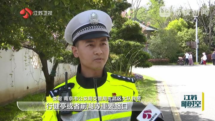 南京市公安局交管局玄武区大队民警娄聪说:“我们的警力在各个重要的路口,比如美龄宫、行健亭或者前湖等重要路口现场指挥交通。大家如果在游玩的过程当中遇到什么情况,可以及时向他们进行求助。”