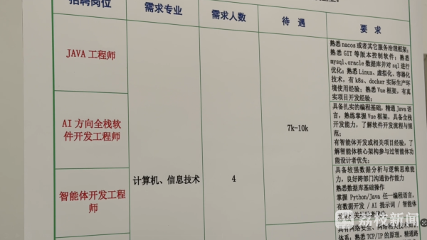 招聘企业人力资源专员沈在娟介绍:“今年面向应届生开放AI全栈开发、智能体等岗位。相比往年,要求更‘实’——除基础理论,还要求AI技术落地能力,面试增加实际考核。”