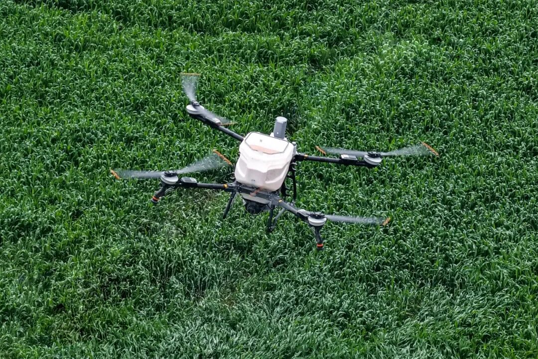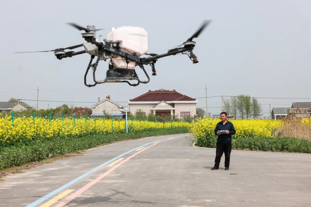 在步凤镇三龙村的大片农田里,绿油油的麦浪随风起伏,一架植保无人机在飞手柏绘的操控下,沿着预设航线精准飞行,将肥料均匀洒向麦田。